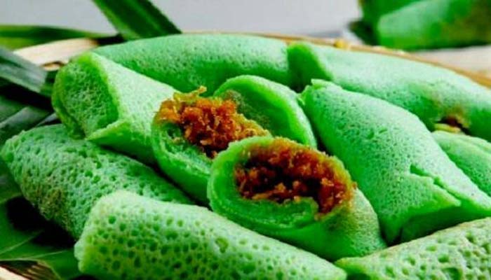 Bahan kulit dadar : – 250 gr tepung terigu – 2 sdm tepung kanji – 65 ml santan kara (1 sachet) – 1 butir telur – 2 sdm minyak – 600 ml air – Pasta pandan – Garam Bahan unti kelapa : – 200 gr kelapa parut – 100-150 gr gula merah (iris) – 200 ml air – 2 lembar daun pandan