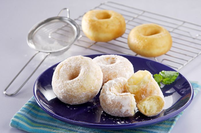 Campur tepung terigu, gula, ragi instan, baking powder dan garam, aduk dengan tangan. Tambahkan kuning telur, uleni hingga berbentuk butiran halus. Tuangkan susu cair sedikit demi sedikit. Uleni hingga tercampur rata. Tambahkan mentega, uleni lagi dengan gerakan memutar, sesekali banting adonan. Lakukan hingga adonan licin dan kalis, kurang lebih 15 menit. Kumpulkan adonan menjadi satu dalam baskom. Tutupi dengan kain bersih, diamkan sebentar. Cetak adonan dan diamkan sampai mengembang. Panaskan minyak lalu goreng sampai matang. Dinginkan lalu beri toping sesuai selera.